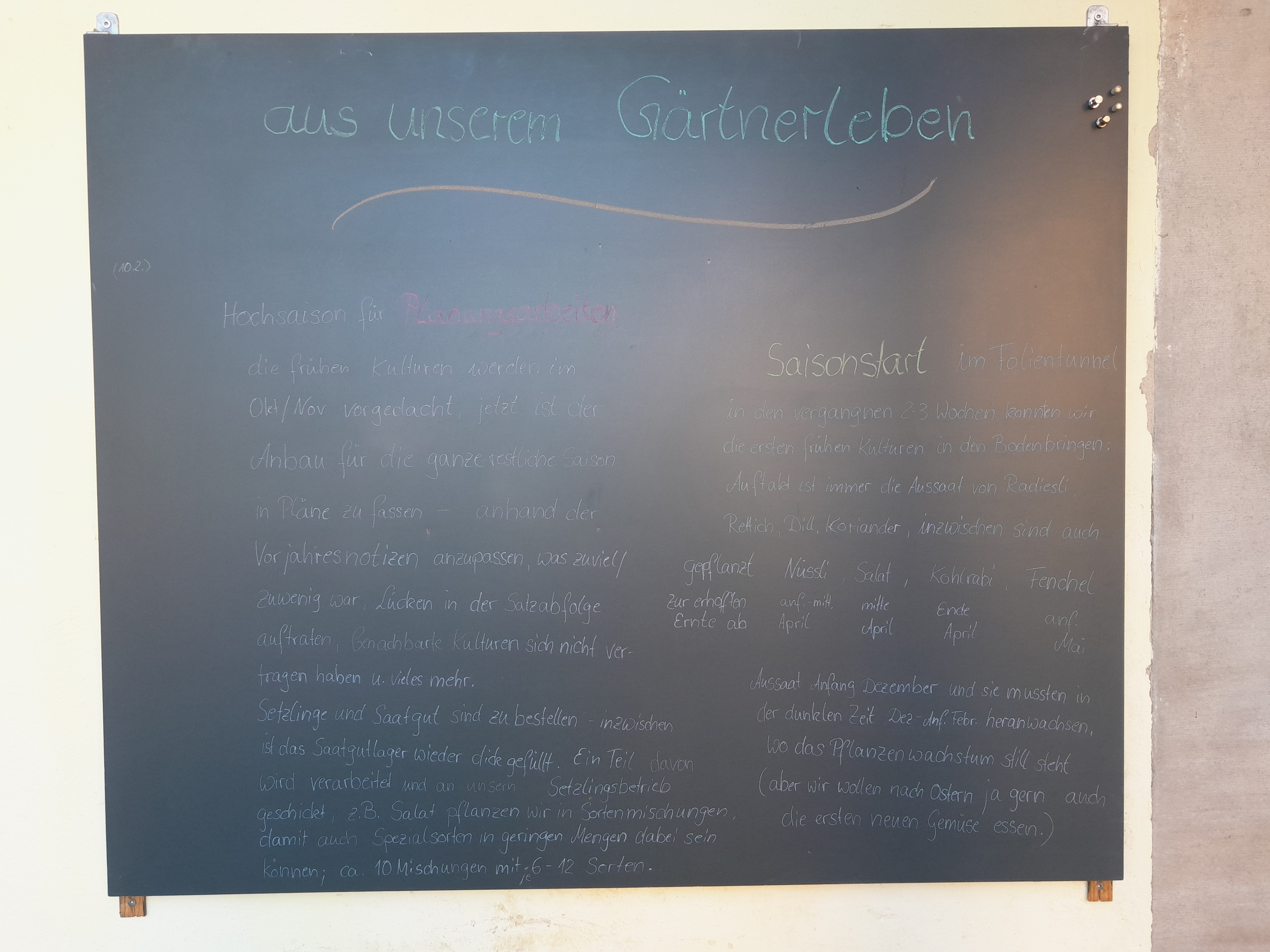 "aus dem Gärtnerleben" (8) Zum Saisonbeginn starten wir wieder mit unserer Rubrik "aus dem Gärtnerleben", in Original-Handschrift an der Schultafel links vom Hofladen-Eingang. Preisgestaltung im Gespräch Samstagspalaver vom 7. Februar 2026